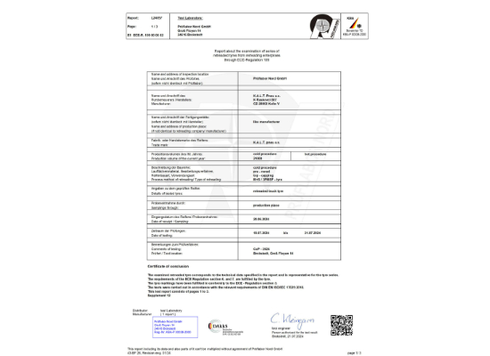 Protektory podrobujeme testování, které je stejné jako testování zcela nových pneumatik. Hotové produkty jsou tedy velmi spolehlivé a můžeme je vybavit certifikací podle evropské normy ECE 109.